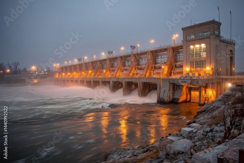 Naklejka premium The hydroelectric dam at dusk, featuring powerful flowing water and...