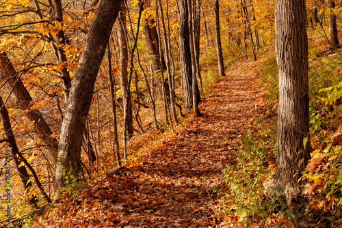 © Drake Fleege, Obraz premium The Ice Age National Scenic Trail makes its way through the woods in Ridge Run Park, West Bend, Wisconsin in late October as the morning sun periodically casts shadows from the nearby trees