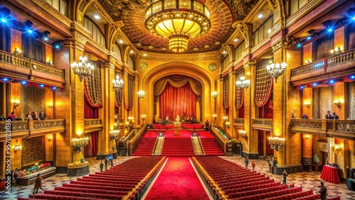 Obraz premium The iconic Academy Awards ceremony venue, a grand historic theater with ornate details, red carpet, and gleaming golden accents, awaiting Hollywood's biggest stars.