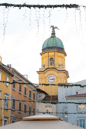 © TatiG, Naklejka premium The iconic City Clock Tower (Gradski Toranj) in Rijeka, Croatia, framed by festive Christmas lights hanging across the street