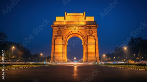 © Puttipong, Obraz premium The iconic India Gate in New Delhi, illuminated at night.