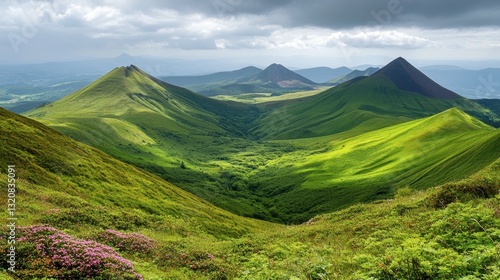 © Puttipong, Fototapeta premium The iconic peaks of the Auvergne volcano range, with green slopes and distant mountains.