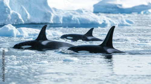 © Theeranan, Fototapeta premium The icy waters of Antarctica, with a group of orcas swimming near the edge of the ice.