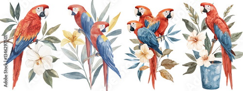 Fototapeta premium The illustration is a hand drawing of a red macaw, a tropical parrot, surrounded by orchids and a leaf, all on a clean white background