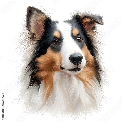 Fototapeta premium The illustration of a beautiful Collie features the breed's distinctive long, flowing fur, perky ears, and intelligent expression, captured in intricate detail against a clean white background