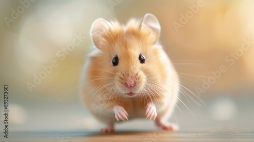 Fototapeta premium The image captures a cute hamster standing on two legs, with its tiny paws in front, and looking directly forward. It evokes feelings of curiosity and whimsy.