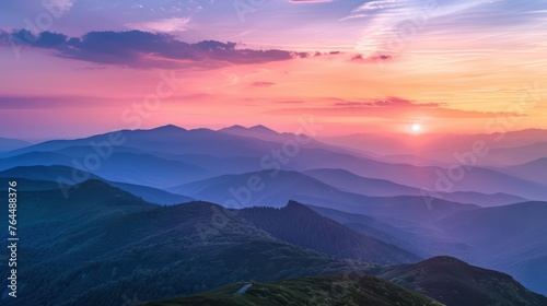 Obraz premium The image captures a stunning sunset with vibrant hues of pink, purple, and blue cascading over multiple mountain ranges, creating a tranquil atmosphere