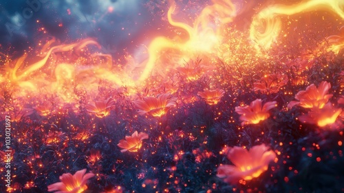 Naklejka premium The image captures a surreal scene of glowing flowers surrounded by sparkling...