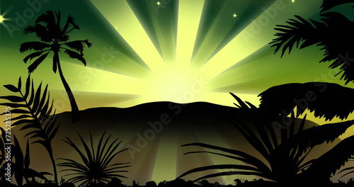 Naklejka premium The image captures a tranquil tropical sunset with palm trees, offering a...