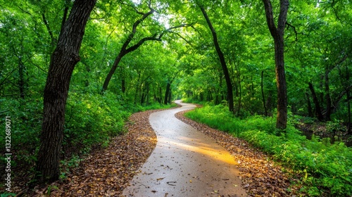 Fototapeta premium The image captures a winding path cutting through a dense forest of towering...