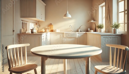 © NN AI, Fototapeta premium The image depicts a blurred modern kitchen interior background with a wooden table space for product montage.