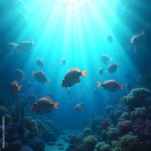 © Masum, Naklejka premium The image depicts a vibrant underwater scene featuring a school of fish swimming amidst coral and clear water, with sunlight filtering through the water.