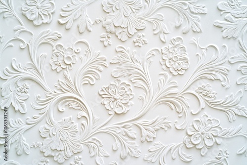 Fototapeta premium The image displays a close-up view of a wallpaper with intricate floral patterns and ornate designs. The texture is thick and the design adds an elegant touch to any room.
