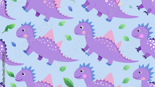 © Ali, Fototapeta premium The image displays a pattern featuring purple dinosaurs with pink spikes on their backs and green leaves scattered throughout the background on a light blue surface