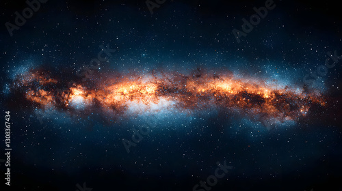 © virza, Fototapeta premium The image displays a stunning view of a galaxy with a vibrant orange core and a dark, starry background.