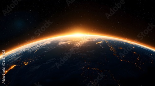 © Archara, Fototapeta premium The image displays a stunning view of Earth from space, with a bright golden sunrise visible on the horizon illuminating cloud cover and city lights at night.