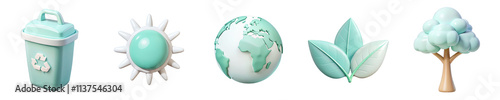 © Thanapipat, Naklejka premium The image features a collection of five mint-colored objects representing environmental themes: a trash can, sun, globe, leaves, and a tree.