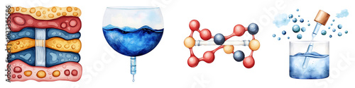 © Nitchalee N., Obraz premium The image features a colorful illustration of scientific concepts related to water, including structures, molecules, and fluid dynamics.