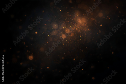 © MDABULKALAM, Fototapeta premium The image features a dark abstract background with deep black tones, soft orange blurry light flares, scattered light particles, and subtle lens scratches, creating a moody cinematic texture.