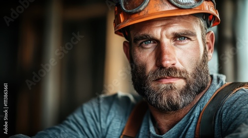 © JoxyAimages, Fototapeta premium The image features a determined construction worker, fully equipped with a helmet and goggles, symbolizing the dedication and resilience required in the building industry.