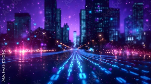 Fototapeta premium The image features a pink and blue digital city with elements of future...