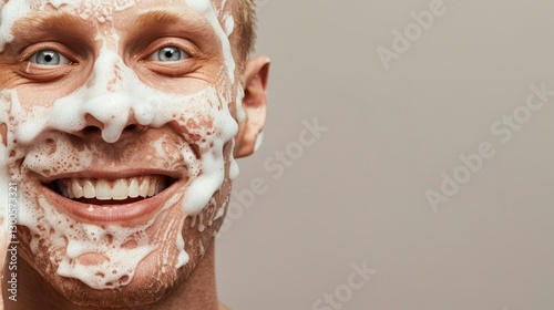 Naklejka premium The image features a smiling man with foamy hands from washing his face.
