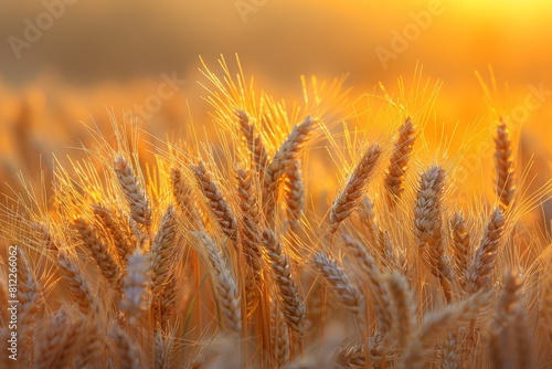 Fototapeta premium The image features close-up golden wheat ears with the warm light of the sunrise creating a backdrop