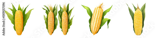 © Nitchalee N., Obraz premium The image features five ears of corn arranged in a row against a black background, highlighting their vibrant yellow kernels and green husks.