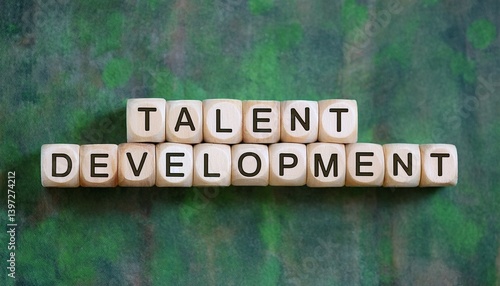 © TransPicHub, Fototapeta premium The image features wooden blocks spelling "TALENT DEVELOPMENT" against a textured green background.
