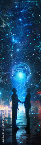 Naklejka premium The image is a beautiful depiction of a couple standing in a city at night. The city is lit up by the stars and the couple is surrounded by a