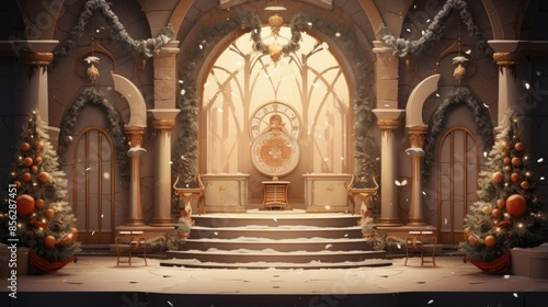 © BozStock, Fototapeta premium The image is a beautiful depiction of a winter wonderland. The snow-covered landscape is dotted with pine trees and decorated with twinkling lights.