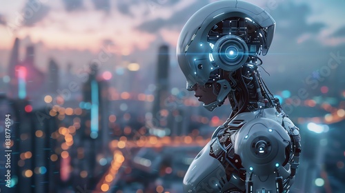 Fototapeta premium The image is a 3D rendering of a futuristic city. The city is full of tall buildings and skyscrapers, and there are flying cars and robots everywhere.
