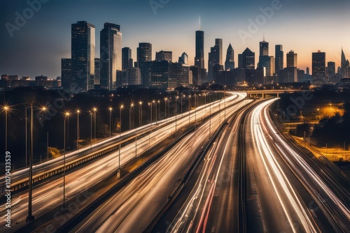 © motiva_dsgn, Fototapeta premium The image is a long exposure photo of the city skyline at night. The sky was dark and the buildings were brightly lit, creating a beautiful contrast to the bright city lights.