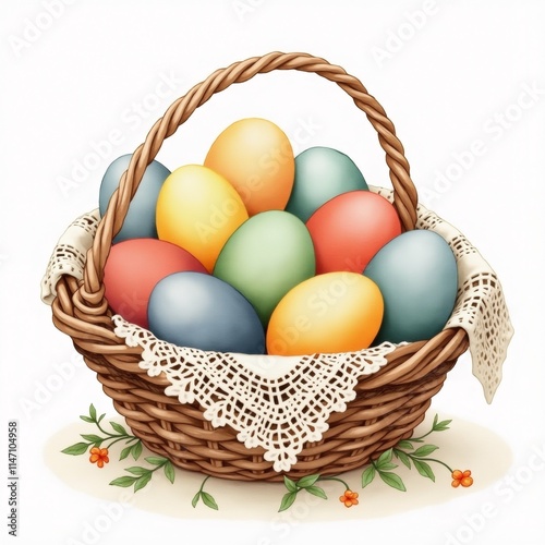 © IgorImageDoc, Naklejka premium The image is of a basket filled with colorful eggs. The basket is made of woven straw and has a white lace doily tied around the handle.