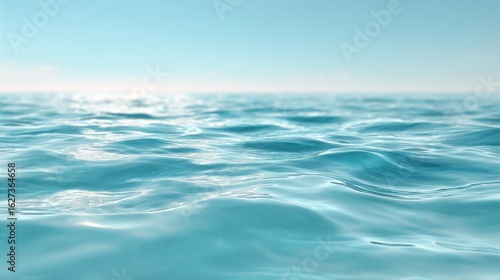 © mila103, Naklejka premium The image is of a calm ocean with a blue sky in the background. The water is still and the sky is clear, creating a peaceful and serene atmosphere