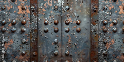© Irfanan, Fototapeta premium The image is of a rusted metal door with many holes and screws