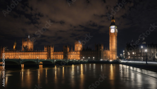 Obraz premium The image is of the Houses of Parliament in London, England. It is night time...