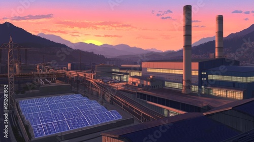 Naklejka premium The image of solar panels reflecting sunset light in a mountainous setting conveys the idea of harnessing clean energy