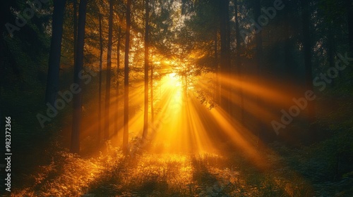 Naklejka premium The image of the morning sun shining through the shadows of the forest on a new morning, conveys a new beginning, hope, an image that gives a feeling of positive energy to the mind.