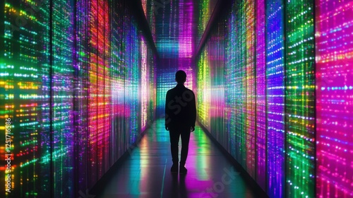 Fototapeta premium The image portrays a faceless person amid a data center filled with vibrant...