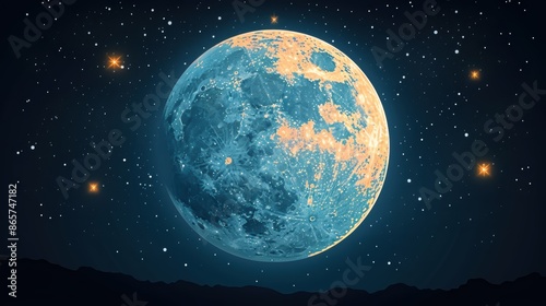 Fototapeta premium The image presents a bright moon in hues of blue and yellow amidst a starry...