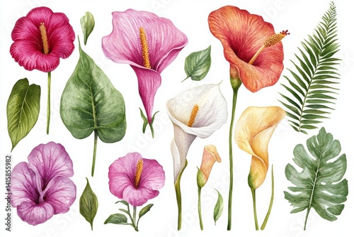 © Julia, Obraz premium The image presents a watercolor illustration of various tropical plants and flowers, including palm leaves, rose, hibiscus, pansy, and fern, all on a white background