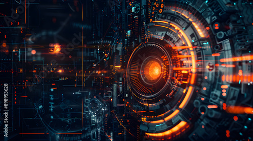 © Oleksandra, Obraz premium The image showcases an abstract futuristic digital interface filled with glowing orange circles, binary data, and intricate circuitry, making it perfect for tech and cyberspace themes