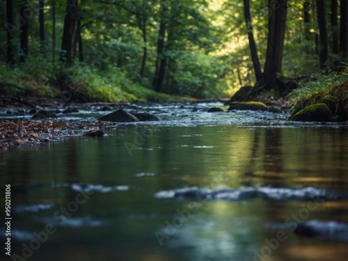 Naklejka premium The image shows a beautiful forest with a small river running through it.
