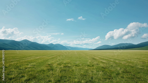 © Oranuch, Fototapeta premium The image shows a beautiful landscape with green fields and mountains in the distance.