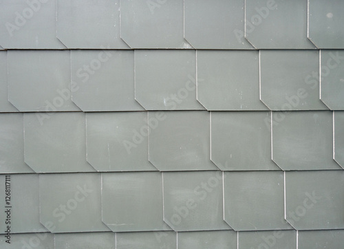 © Anja, Naklejka premium The image shows a close-up of a wall made up of gray tiles. The tiles are arranged in a grid-like pattern, with each tile having a hexagonal shape. The texture of the tiles is rough and uneven
