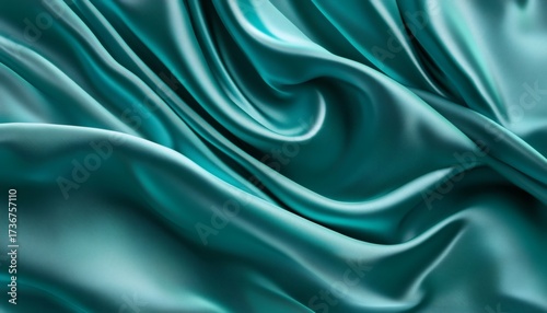 © Studicon, Obraz premium The image shows a close-up view of teal-colored silk fabric, exhibiting soft folds and ripples across its surface.