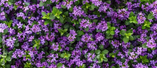 Naklejka premium The image shows a field of purple flowers with green leaves, suitable for use as a background in advertising.