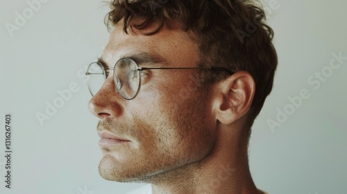 © iuricazac, Fototapeta premium The image shows a man wearing glasses, with short hair, in a white background.