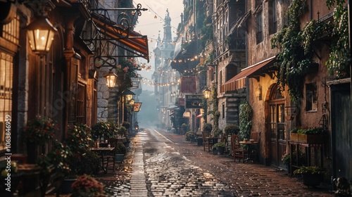 © Ruslan Gilmanshin, Fototapeta premium The image shows a narrow cobblestone street in a charming, old European town. The street is lined with quaint buildings, outdoor cafes, hanging plants, and glowing street lamps.